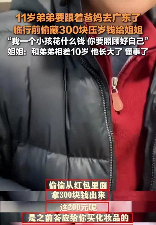 在这个寒冷的冬天,有一个温暖又催泪的故事感动了无数网友,11岁的小男孩为了姐姐留下了自己的压岁钱,并用稚嫩的声音说出了“我是小孩,花什么钱”,这句话让人心碎,也让我们看到了真挚的亲情。
